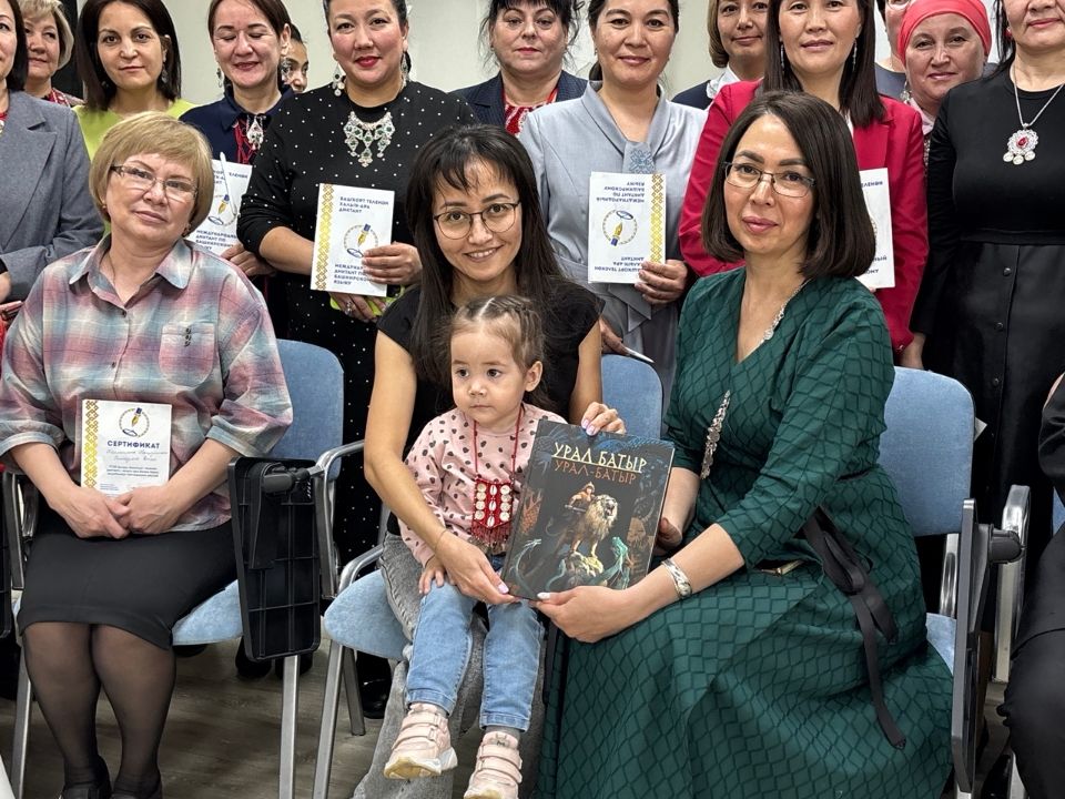 В конце мероприятия Гуллярия Ялчикаева вручила памятный подарок-книгу «Урал-батыр» самой юной участнице акции Лиане Муратшиной – воспитаннице этнокультурного центра «Белемтау».